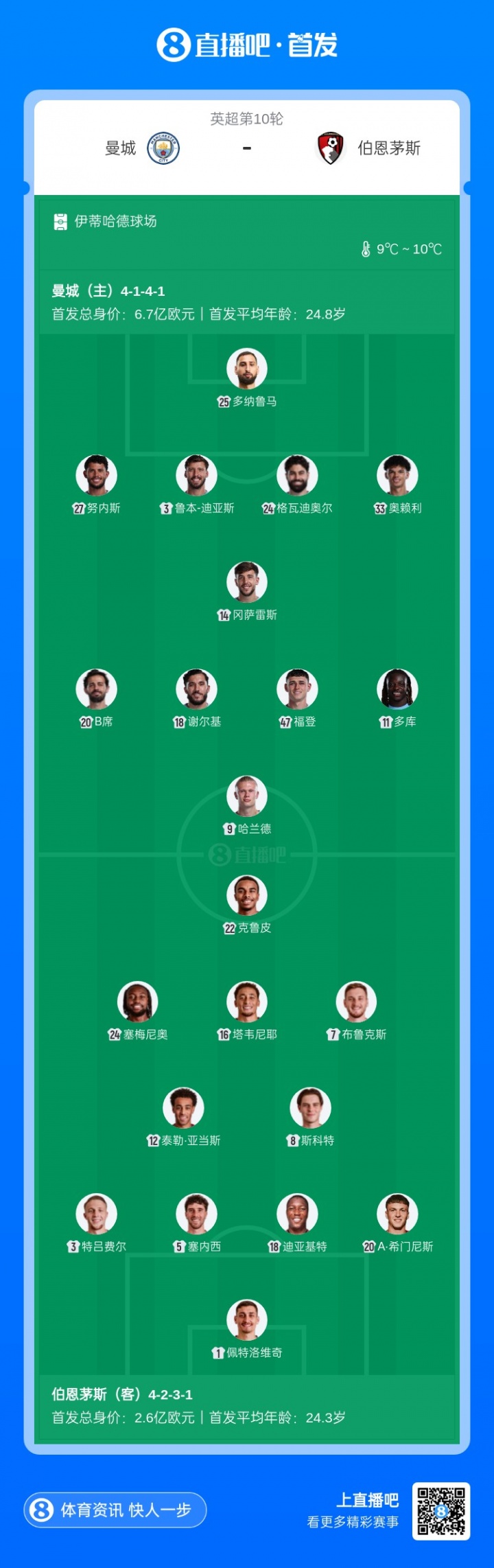 曼城vs伯恩茅斯首发:哈兰德领衔,谢尔基B席先发,福登多库登场